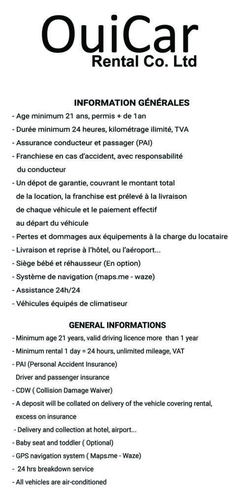 At Ouicar Rental Co. Ltd, we pride ourselves on our diverse fleet of modern, well-maintained vehicles. From compact cars for city exploration to luxury models for special occasions, we have the perfect vehicle to meet your needs. All our cars come with comprehensive insurance and are available with 24/7 assistance to ensure your peace of mind.